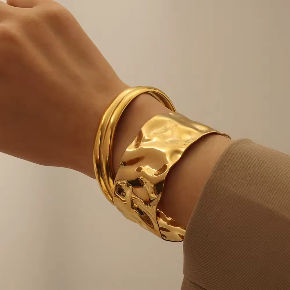 Illuminez votre poignet avec le brassard Molten Radiance, où l'art rencontre l'accessoire. Cette manchette plaquée or présente une surface organiquement sculptée, rappelant l'or en fusion fluide, qui capte à la fois la lumière et l'attention.