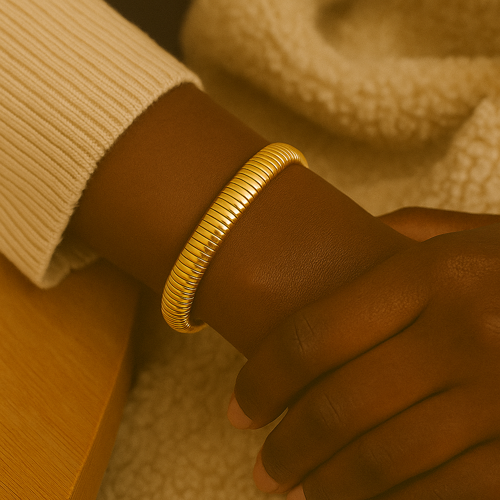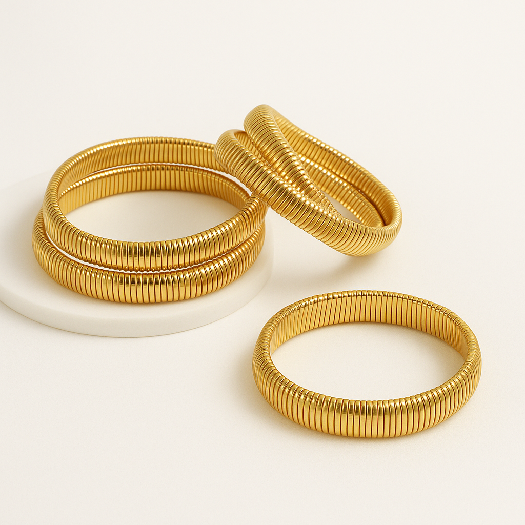 Introducing the Golden Helix Bracelets – a trio of intertwined elegance. These gold-plated pieces bring a contemporary twist to the classic bangle, perfect for stacking or wearing individually.